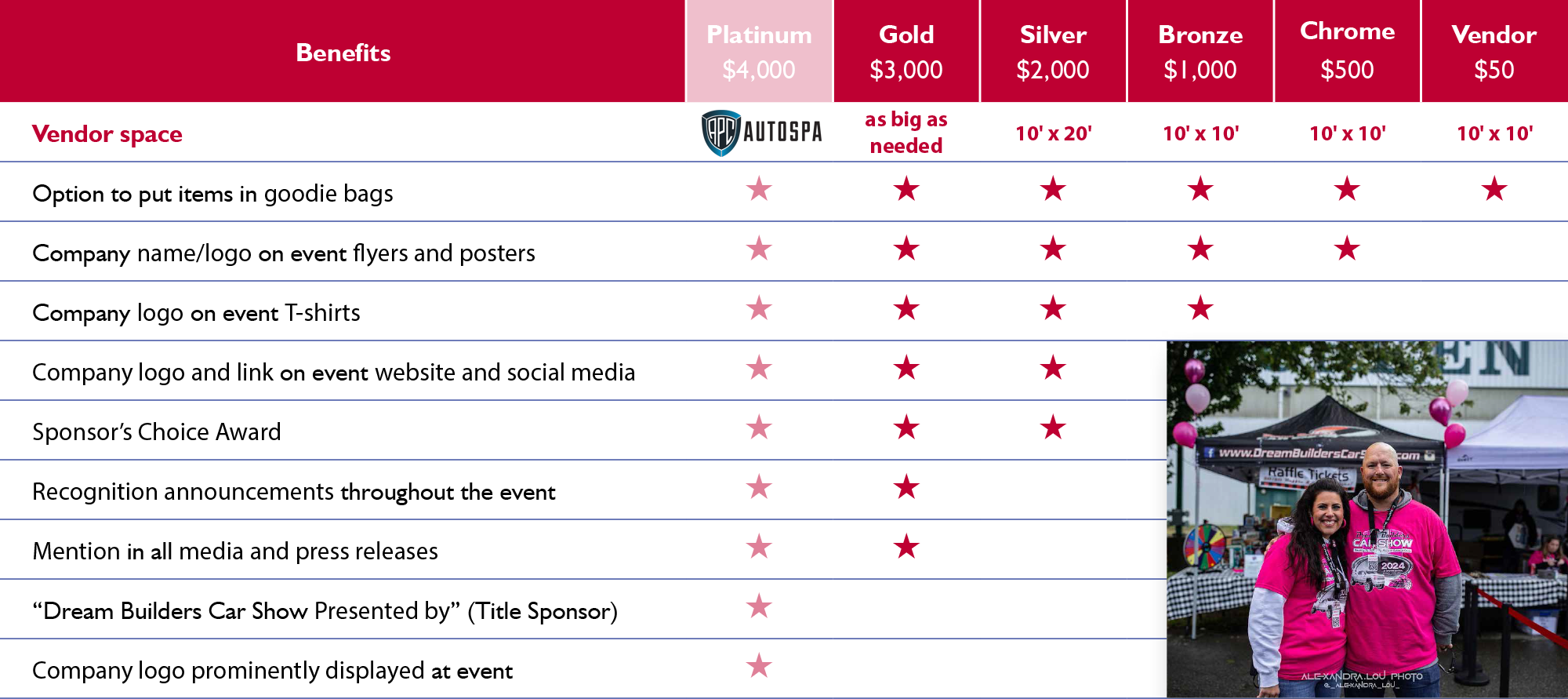 “Dream Builders Car Show Presented by” (Title Sponsor) Company logo prominently displayed at event Mention in all media and press releases Recognition announcements throughout the event Sponsor’s Choice award Company logo and link on event website and social media Company logo on event T-shirts Company name/logo on all flyers and posters Option to put items in goodie bags Premium vendor space, as big as needed, near Registration Gold Sponsor $3,000 Mention in all media and press releases Recognition announcements throughout the event Sponsor’s Choice award Company logo and link on event website and social media Company logo on event T-shirts Company name/logo on all flyers and posters Option to put items in goodie bags Vendor Space as big as needed Silver Sponsor $2,000 Sponsor’s Choice award Company logo and link on event website and social media Company logo on event T-shirts Company name/logo on event flyers and posters Option to put items in goodie bags 10' x 20' Vendor Space Bronze Sponsor $1,000 Company logo on event T-shirts Company name/logo on event flyers and posters Option to put items in goodie bags 10' x 10' Vendor Space Chrome Sponsor $500 Company name/logo on event flyers and posters Option to put items in goodie bags 10' x 10' Vendor Space Show Vendor $50 Option to put items in goodie bags 10' x 10' Vendor Space (No outside Food or Beverage Vendors permitted) ★ See a Sponsorship Tier you’re interested in? Contact Steve Myers @ 425-737-2233 |